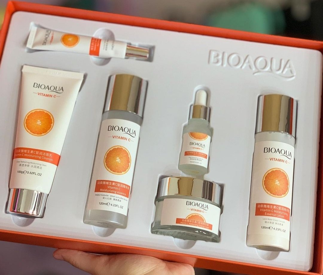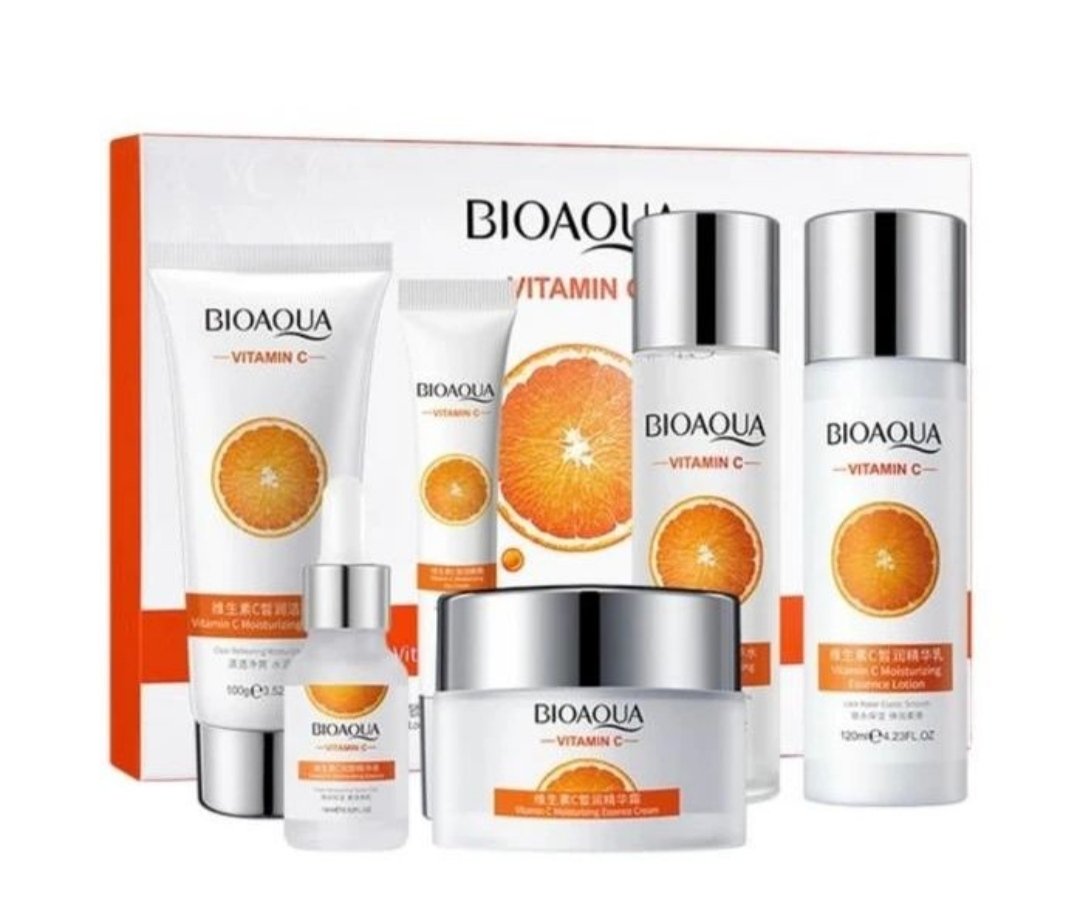 Kit facial premium vitamina C bioaqua 6 productos (jabón facial, crema hidratante, sérum, tónico, loción hidratante, contorno de ojos en crema)